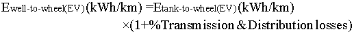 For EV, energy from Tank to Wheel is 0.20 kWh/km, but when transmission and distribution losses (26% in 2009-10) are included;
