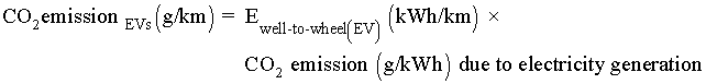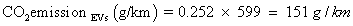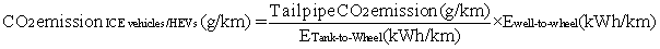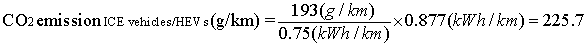 Overall CO2 emission (g/km) for ICE vehicles and HEVs is calculated as: