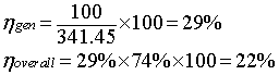 If for instance, India's output production is assumed to be 100 MW, then, coal based power plants generate about 53.4 MW. Considering its generation efficiency of 23%, 53.4 × 100 / 23 = 232.17 MW of input power is required. Similarly, for other generation technology, the input power is calculated and then summed to be 341.45 MW. The overall electricity generation efficiency is