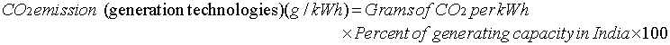 | Electricity generation technology | Grams of CO2 per kWh | Percentage of generation capacity | Contribution in CO2 emission (g/kWh) |