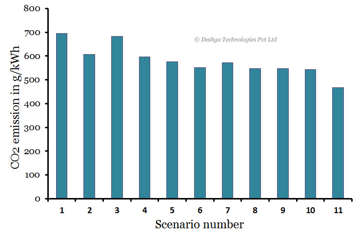 Estimation of CO2 generated for various scenarios proposed by the Planning Commission of India are calculated and tabulated below (Table 1.3). Intensive coal based scenario 1 provides the maximum emission at 695 g/kWh while forced renewable (scenario 11) lowers the emission down to 467 g/kWh. It is seen that the difference of CO2 emission between these extreme scenarios is nearly 33% (Table 1. 3). Thus, it can be seen from figure 1.1