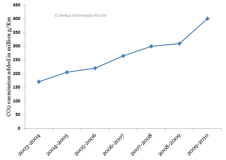 Figure 1.2: CO2 emission for the annual passenger vehicle production trends in India. shows the growth of extra CO2 emission added annually according to SIAM annual passenger vehicle production trend from 2003-04 to 2009-10. It clearly shows the impact of vehicle pollution on atmosphere and future trends.