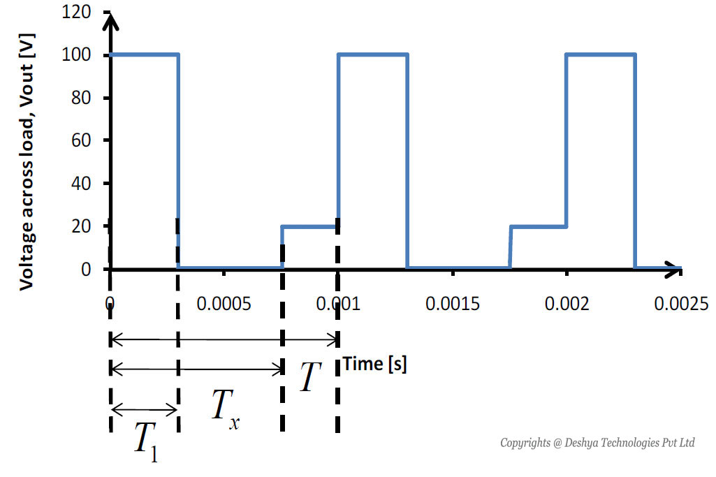 The duty cycle D can be varied from 0 to 1 by varying T1, T or f. Thus, the output voltage Voavg can be varied from 0 to Vin by controlling D and eventually the power flow can be controlled.