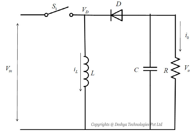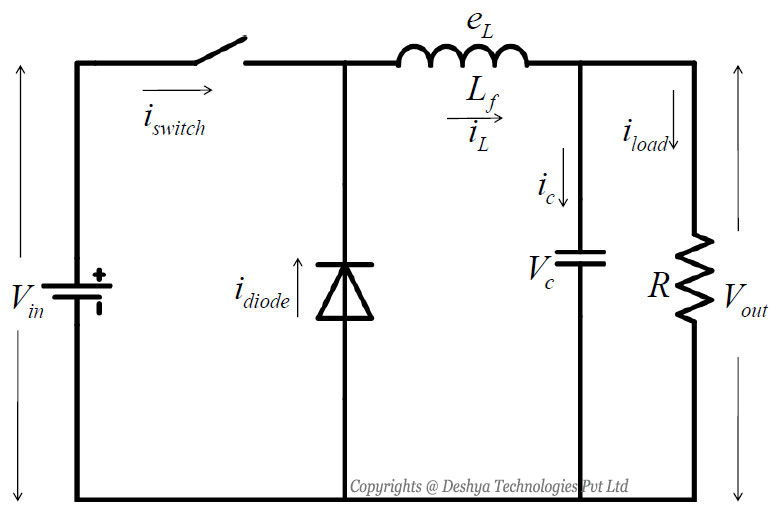 Figure 8.14: General configuration of buck converter. the plot of ILB as a function of D, keeping all other parameters constant, is shown. The output current required for a continuous conduction mode is maximum at D = 0.5 and by substituting this value of duty ratio in equation 8.66