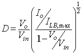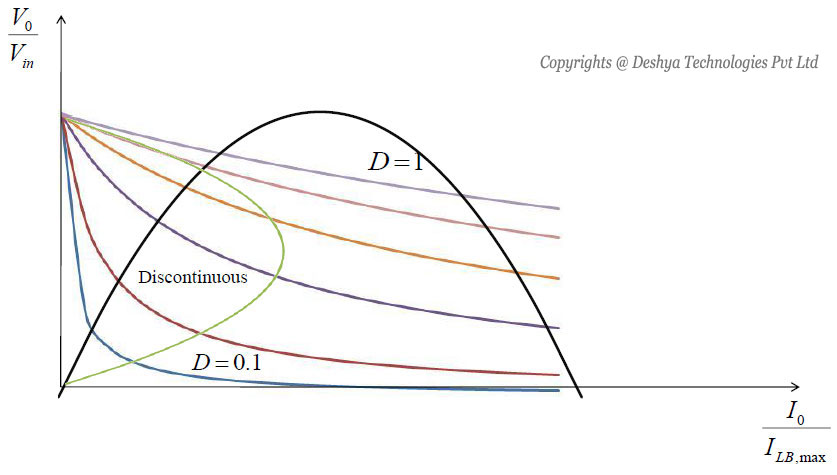 Figure 8.16: Buck converter characteristics for constant input current. the step down characteristics in continuous and discontinuous modes of operation is shown. In this figure the voltage ratio (Vo / Vin) is plotted as a function of Io / ILB, max for various duty ratios using equation 8.55