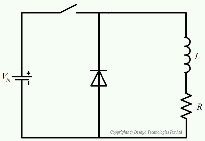 In this mode the switch S1 is turned on and the diode D1 is reversed biased, the current flows through the load. The time domain circuit is shown in figure 8.4a